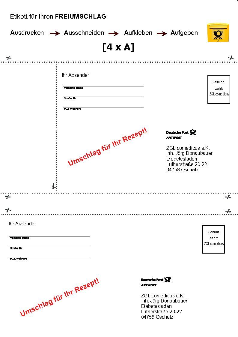 Sie haben einen Freiumschlag von uns erhalten, schicken Sie das Rezept kostenfrei per Post zu uns.